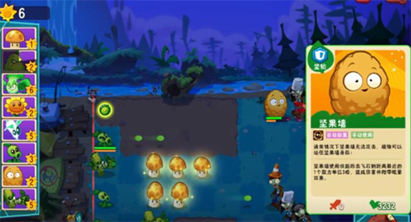 坚果墙是爆竹火枪手阵容的核心防线。其生命值高达4000点,消耗仅2点阳光,冷却时间短,可在多波僵尸进攻中持续构建防御。放置在第一排可有效吸收伤害,为后排争取输出空间,是高性价比的防守首选。