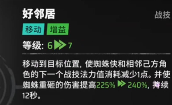 好邻居:位移+增益技能。可迅速调整位置,同时为队友降低战技法力消耗,并提升“蜘蛛重砸”伤害,持续12秒。适合衔接队伍爆发或关键时刻节省资源。