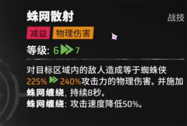 蛛网散射:范围伤害技能,附带“缠绕”状态,降低敌方攻速并触发蜘蛛人的反击机制。适合用来打乱敌方节奏,同时提升控制链稳定性。