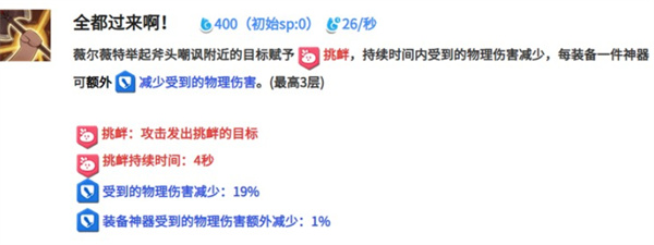 附加机制:挑衅期间自身体质强化,物理伤害减免。神器装备可叠加至3层,提升抗压能力。
