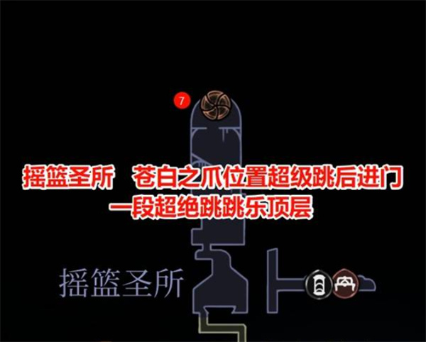 摇篮圣所,苍白之爪位置。需超级跳登顶,进入门后完成一段高难跳跃到最上层。