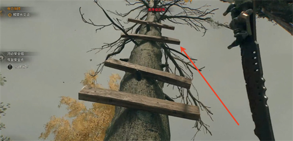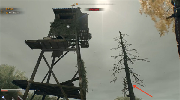 在安全塔旁边有一棵树,利用树干作为落点,开始向塔的高处移动。