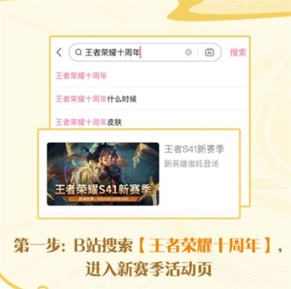 1、打开B站搜索【王者荣耀十周年】,进入新赛季活动页面。