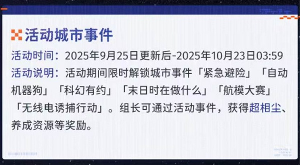限时解锁[紧急避险]、[自动机器狗]、[科幻有约]、[末日时在做什么]、[航模大赛]、[无线电诱捕行动],可获得超相尘、养成资源。