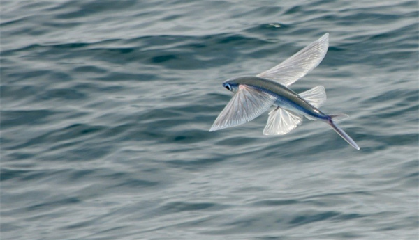 “鱼身而鸟翼”形容的正是飞鱼。飞鱼体型和一般鱼类相似,却拥有一对特化的巨大胸鳍,如同鸟翼一般展开时能在海面上滑翔。它们通常在受到天敌追逐或受到惊扰时,会急速跃出海面,依靠胸鳍和尾鳍的配合在空中滑翔数十米甚至上百米。飞鱼多分布在热带、亚热带的海洋中,是海洋生态系统中的独特存在,也因其能“飞”而备受人们惊叹。
