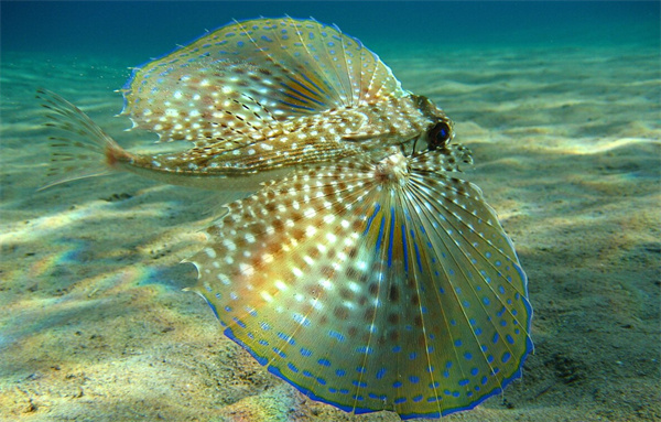 豹鲂鮄因胸鳍极为宽大,形似翅膀,在水中张开时就像要展翅飞翔,因此被称为“飞角鱼”。它们分布于热带和亚热带海域,游动时既能快速滑行,又能凭借鳍的展开制造独特的姿态。