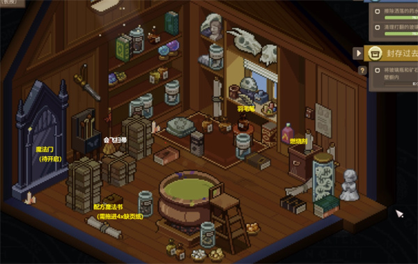 进入房间后,地面上会有一本配方魔法书。这是触发解谜的关键。玩家需要收集缺失的书页: