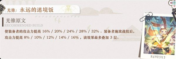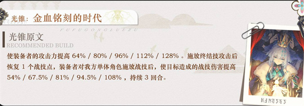 提供大量攻击力加成,进一步强化刻律德菈天赋的【军功】攻击力提升与暴击伤害转化能力。释放战技后可为目标角色增加3回合战技伤害,大幅增强辅助效果。释放终结技还能回复1个战技点,保证队伍循环稳定。