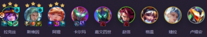 2星拉克丝-核心输出,4法师羁绊,2斗魂前排,一个合格的主坦/副坦(如皇子、赵信等)