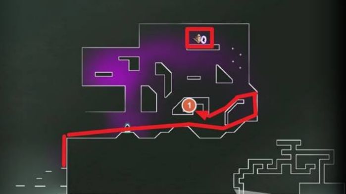 沿着红色路线攀爬至右侧的紫色区域,途中需要使用抓爬能力。继续沿红色路线前进,到达红色标识1处开启宝箱,可获得【胧珠】。