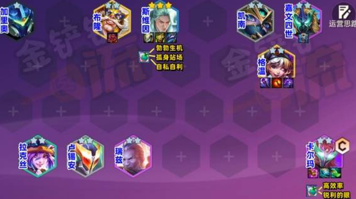 可用法师+护卫组合,或3超级+2法师过渡。利用1费卢锡安或2费拉克丝搭配卡尔玛装备打工,保持连胜,容错率高,赢多输少即可稳定发展。