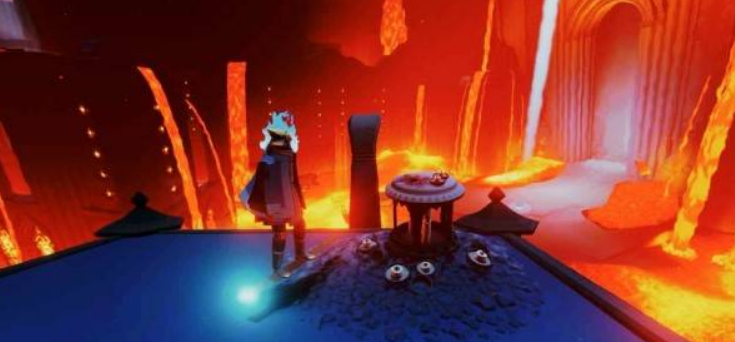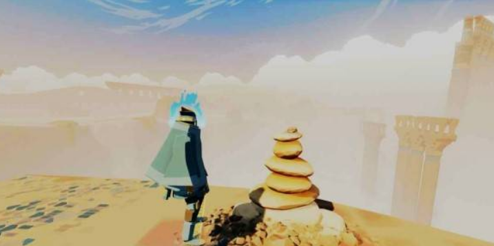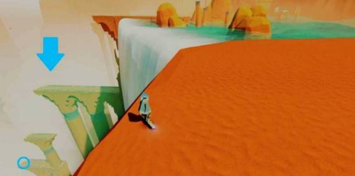 往下看能看到一段细长瓦顶,通往远处石柱。穿过瓦顶后,沿石柱边缘跳跃前进,青蛙就在终点等待。