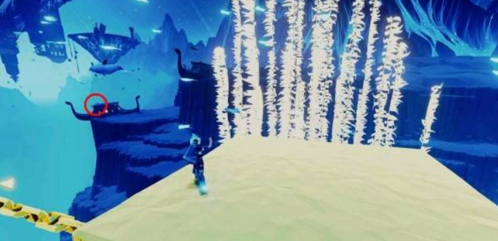 激活圆球水源点后,启动右侧锁链。随后利用建筑后方新生成的海草跳至瀑布顶端。