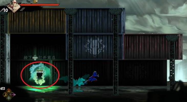 通过右上方锁链机关,向左侧高台移动。击败高台敌人,解锁宝箱,获得【手里剑持有数提升】。