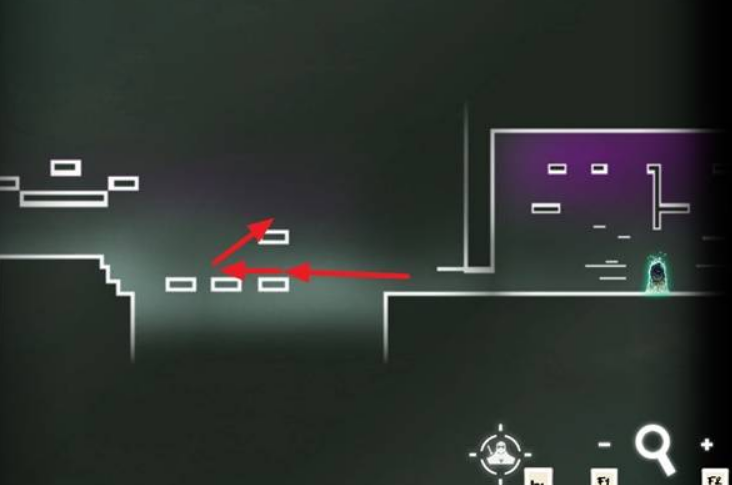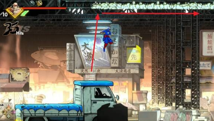 清理周围敌人,走到右侧出口,抓住墙壁跳到中间平台,连续跳到左侧墙壁,绕到顶层平台。