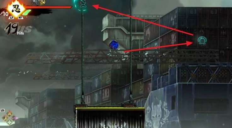 连跳到中间的集装箱,利用集装箱从左上往右下运动形成的高低差,跳到右侧上方集装箱。