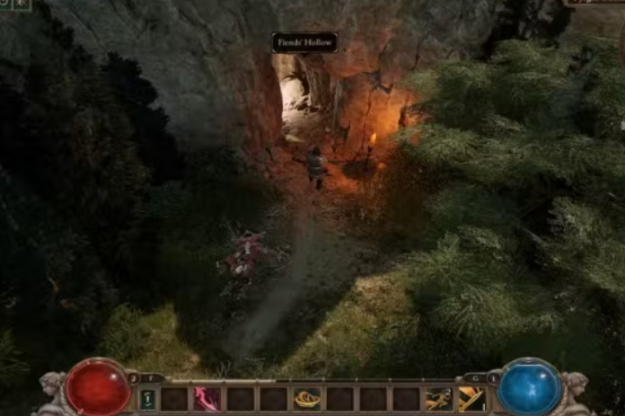 玩家的目标是前方的恶魔洞(Fiend's Hollow)入口,洞穴内共有三个牢笼,但只有其中两个关押着囚犯。