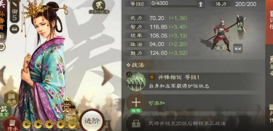 传承战法方面,孙鲁育拥有1回合冷却的近战谋略伤害技“策破连营”,能对敌方造成354%的谋略伤害,特别适合针对密集站位的敌人,在特定场合威力惊人。此外,她能减少异常状态敌军的伤害,为队伍提供额外防护。