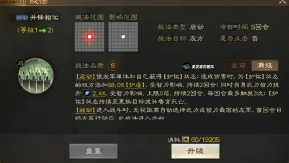 自带的核心战法“锋相佑”能够为友军提供强力护盾,每回合最高叠加588%的护盾值。战法启动时,会为孙鲁育及指定的友军附加护佑状态,攻击均获得98%的护盾加成,持续两回合,同时还能提升武力和智力属性,最多叠加六层。