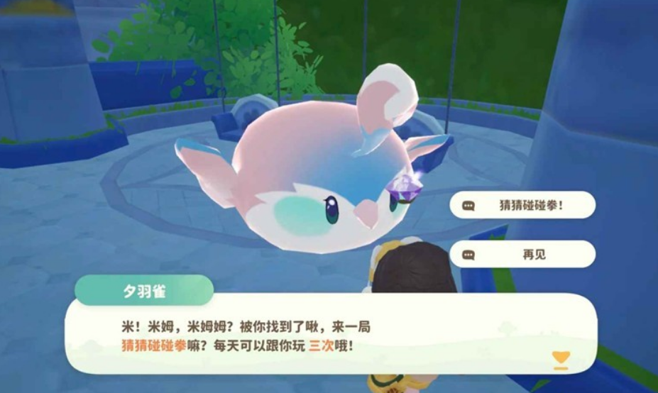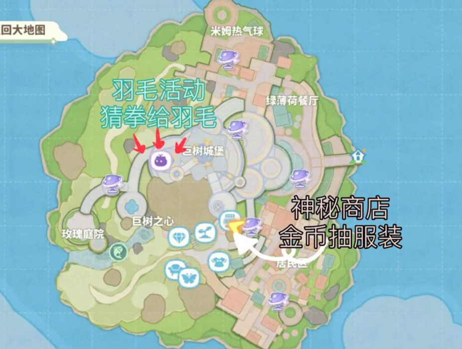 玩家可以根据以下图中所示位置找到活动米姆,和它进行猜拳游戏即可参与活动。每天可进行三次,无论输赢都能获得羽毛。