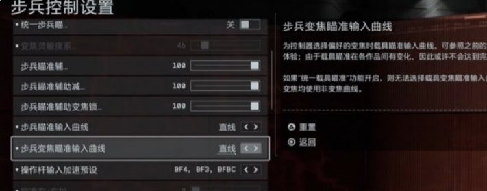 接着往下拉,找到步兵瞄准输入曲线和步兵变焦瞄准输入曲线选择直线。