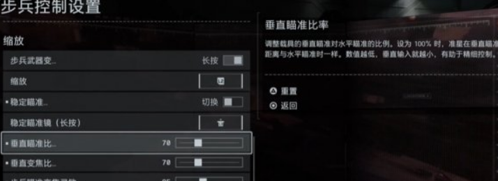 再继续往下拉,找到垂直瞄准比率和垂直变焦比率调到70,步兵瞄准变焦灵敏度调到85。