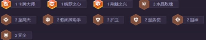 1卡牌大师、1魄罗之心、1荆棘之兴、3水晶、2至高天、2假面、2护卫、2圣盾使、2狙神、2司令