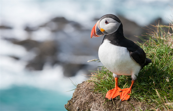 海鹦最显著的特征就是那张鲜艳宽大的喙,尤其在繁殖季节时,喙会呈现出明亮的红、橙、黄相间的色彩,看起来像一张“彩色面具”。这种独特的外貌让海鹦在众多海鸟中极为醒目,因此也被称为“海上小丑”。它们不仅外形可爱,飞行与游泳能力也很强,会用翅膀在水下“划水”捕食小鱼。繁殖季过后,喙的色泽会逐渐褪淡,这也是区分繁殖期与非繁殖期海鹦的重要标志。