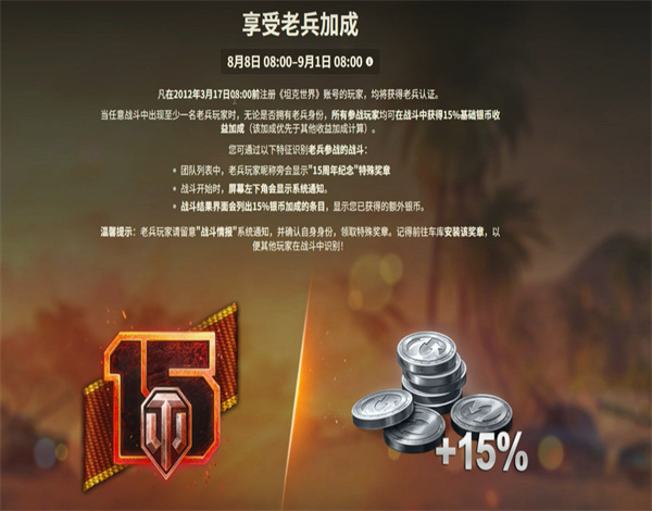 以上就是坦克世界15周年庆老兵认证如何获取全部内容,希望对你有帮助。想查找更多游戏攻略,欢迎持续关注查看。