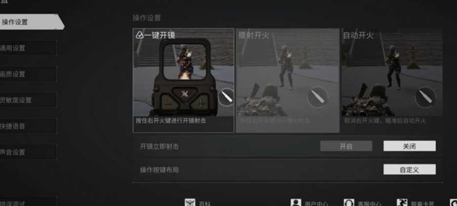 首先,进入游戏设置界面,找到“操作设置”选项。在左侧第一栏我们就可看到“一键开火”开关,开启后玩家需要同时按住开火键即可同时完成开镜与射击,省去单独点击开镜的步骤。