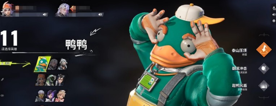 典型的进攻型英雄。他的翻滚技能会使他变成高速旋转的圆球,击飞路径上的敌人并获得减伤效果。超鸭风盾可以召唤透明护盾阻挡子弹和投掷物,同时不影响自身移动。其终极技能是可以高高跃起后砸向地面,对敌人造成伤害和击飞效果。