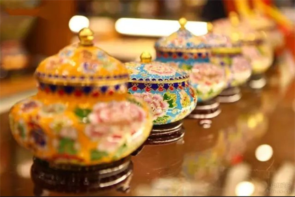 珐琅釉料色泽丰富、稳定耐久,是景泰蓝器物精美外观的重要保障。这种工艺体现了中国传统手工艺术的高度审美与技艺水平。