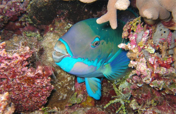 鹦哥鱼的牙齿紧密排列,融合成坚硬的喙状结构,形状酷似鹦鹉的嘴喙,因此得名“鹦哥鱼”。这种独特的牙齿结构使它能刮取并咀嚼珊瑚表面的藻类或碎珊瑚。
