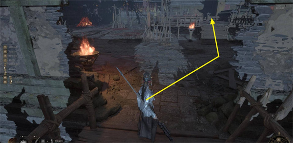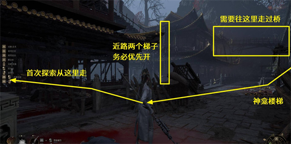 利用两条梯子爬上屋顶,从屋顶桥穿越到右侧宫殿。