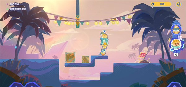 切换回大个子,跳至小矮子头顶拾取空中的娜娜丝梨饼。