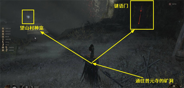 谜题门位于矿洞出口左侧,桥对面即为【云顶城 - 望山村】的神龛,建议先激活以便传送。