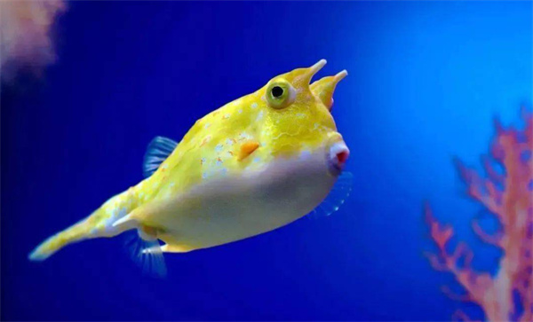 角箱鲀的显著特征是它拥有一个坚硬的“箱状外壳”。这种外壳由骨板构成,几乎包裹了整个身体,使其外形像一个四方盒子,因此被称为“箱鲀”。此外,它头部前方还有一对突出的小角,看起来就像长了“牛角”,因此又名“牛角箱鲀”。这种结构既能有效保护内脏器官,也让它在海中显得与众不同。