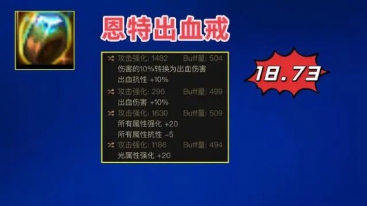 首先,对于出血流来说,可以有2种选择,要么继续使用【恩特出血戒指:出血10%、出血转伤10%、全属强20、单属强20】,提升率“18.73%+10%转伤”。