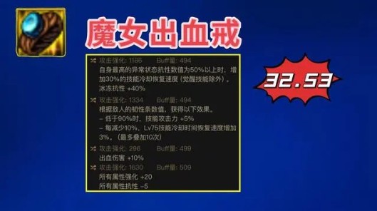也可以选择新晋的【魔女出血戒指:75破韧5、CD恢复30%、出血10%、全属强20】,提升率可达“32.53%”!
