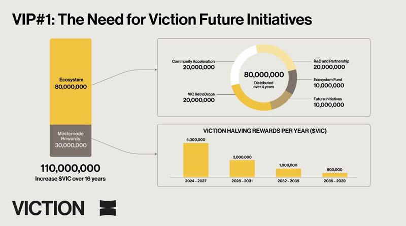 2024 年 10 月的 VIP#1 硬分叉标志着一个重要的里程碑。为了应对日益增长的网络需求,VIC的总供应量增加了 1.1 亿枚。其中,3000 万枚 VIC 被分配用作主节点奖励,以确保网络的安全性和效率。另外 8000 万枚 VIC 用于支持生态系统计划,由 Viction 基金会管理,并计划逐步转到社区治理。