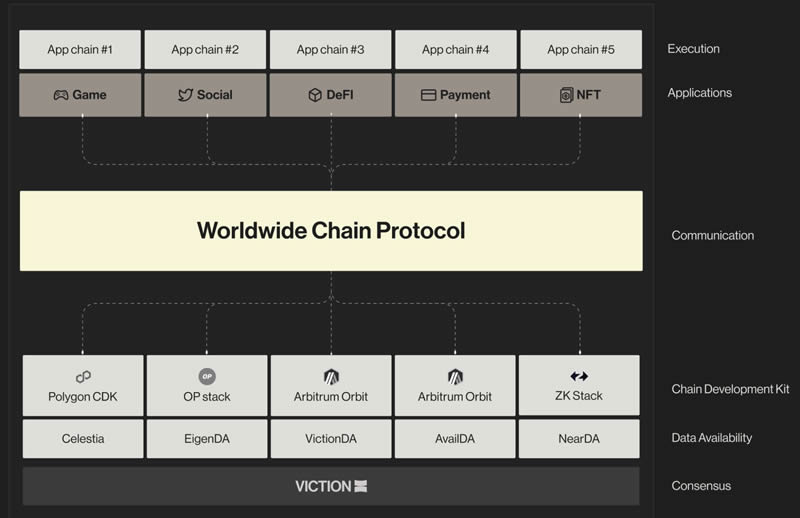 图片直观地展示了该生态系统,展示了游戏、DeFi 和 NFT 等应用链如何在全球链协议中协同工作。它着重展示了与 Polygon CDK、OP Stack 和 zkEVM 解决方案等框架的集成,这些框架在支持 VWWC 内的执行、通信和数据可用性层方面至关重要。