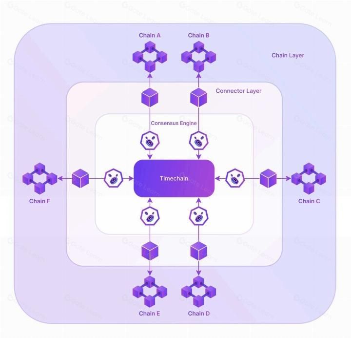 链层: 链层由各种主 权区块链组成,所有这些区块链都通过可访问的 SDK 纳入 Analog,使时间节点能够轻松连接基于 EVM、Cosmos 和 Polkadot 的链。