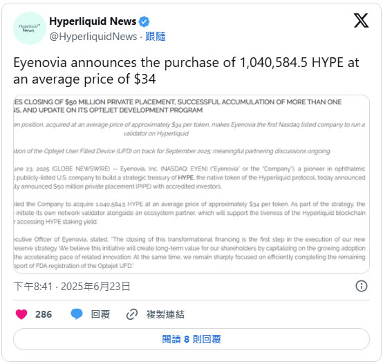 据报道,EyEnovia 已以平均34 美元的价格购入超过100 万枚HYPE 代币。此次购入是5,000 万美元私募的一部分,这使得EyEnovia 成为首家直接入股HYPE 的那斯达克上市公司。