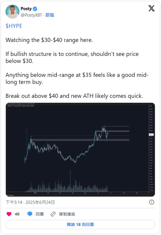 著名加密货币分析师Posty 表示,HYPE 的交易价格处于30 美元至40 美元的非常重要的区间,而该区间正受到密切关注,被视为下一轮 大幅上涨的跳板。大多数人认为,持续的上涨趋势取决于能否守住30 美元的支撑位。