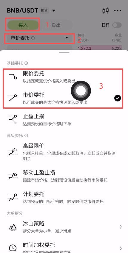 1、如果你想要去交易其他的虚拟货币,我们就可以点击中间的交易按钮,然后在上方这里我们可以搜索任意的加密货币,你想要购买哪个币种都可以使用USDT来进行兑换。比如说我想要购买BNB,我就搜索“BNB”,然后选择第一个“BNB/USDT”,就是我们使用USDT去兑换BNB。