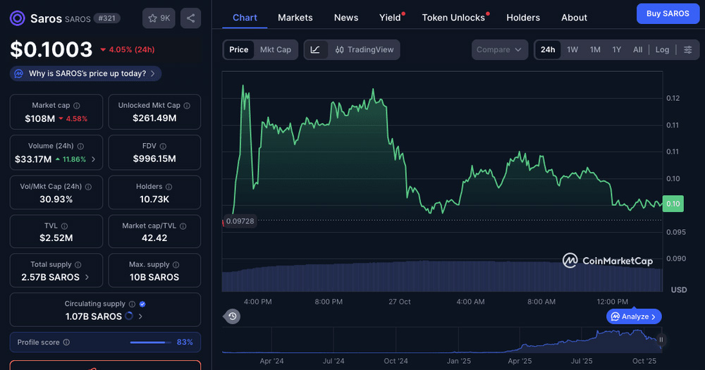 截至今天,SAROS 的交易价格为 $0.1003,过去 24 小时内涨幅为 4.04%。该代币目前的市值为 1.08 亿美元,完全稀释估值(FDV)为 10 亿美元,并且有 24 小时的交易量为 3306 万美元。