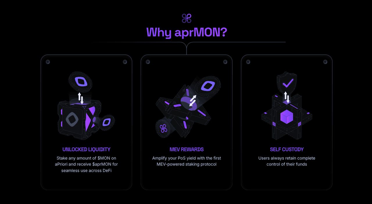 流动质押乍看之下往往相似,但 aPriori 加入了三大支柱,改变了结果:奖励承载 LST (aprMON)、MEV 感知订单流层重新分配价值,以及在 Monad 上的主动验证者重新平衡。