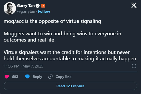 这个运动提倡几个主要价值观。它鼓励自我提升与自律,强调专注与勇气,更重要的是,它主张无须为追求成功与胜利感到抱歉。YCombinator 的首席执行官 Garry Tan 曾说,这是一种「与道德作秀完全相反」的态度。