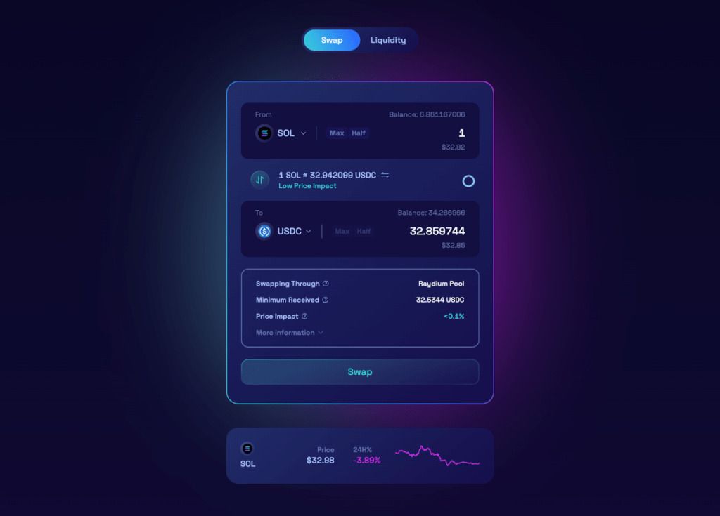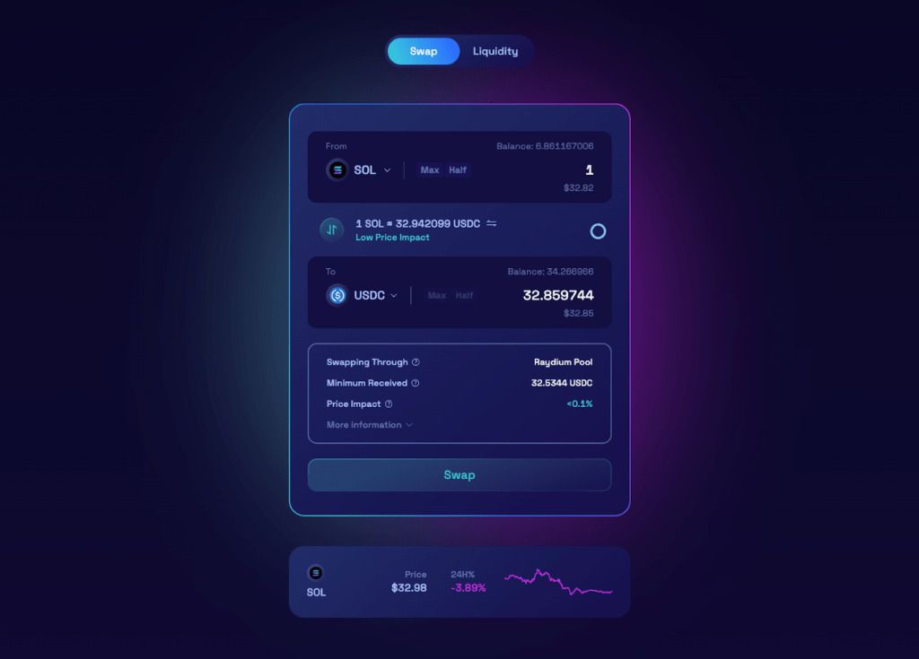 Radium Swap 是一个去中心化交易所,可通过 Serum 实现两种代币之间的即时兑换。与其他独立运营且流动性有限的去中心化交易所不同,Radium 与基于 Solana 区块链构建的去中心化交易所 Serum 相连,并共享一个流动性池。它为各种代币提供多链流动性,并允许用户从 Serum 订单簿中选择流动性池,以进行最具成本效益的代币兑换订单。