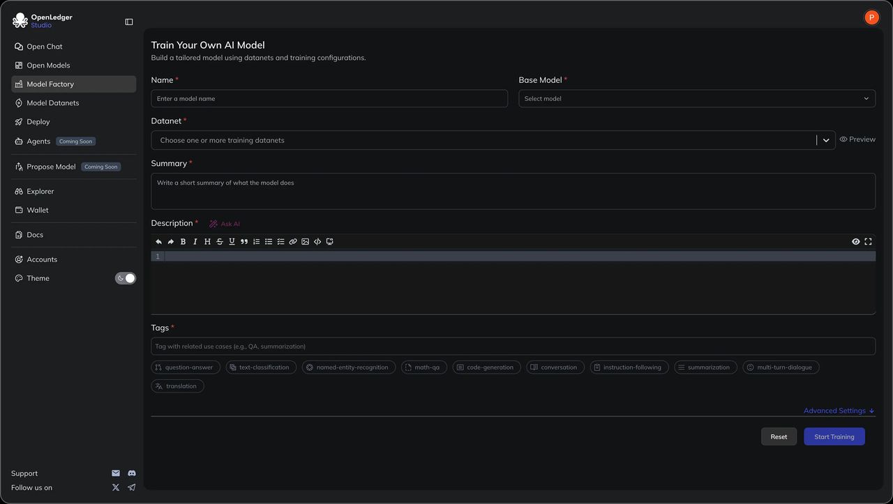 3. 在模型工厂中微调模型:使用无代码的仪表板选择一个基础模型,如 LLaMA 或 Mistral,设置参数,并使用 LoRA 或 QLoRA 进行微调。使用聊天模块即时测试输出,并激活 RAG 归因,使回应附有来源且可信。